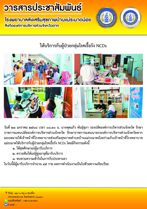 วันที่ ๒๓ มกราคม ๒๕๖๘ เวลา ๐๘.๓๐ น. นางพุดแก้ว พันธุ์สุภา รองปลัดองค์การบริหารส่วนจังหวัด รักษาราชการแทนปลัดองค์การบริหารส่วนจังหวัด รักษาราชการแทนนายกองค์การบริหารส่วนจังหวัดตาก มอบหมายให้เจ้าหน้าที่โรงพยาบาลส่งเสริมสุขภาพตำบลบ้านแม่ระมาดน้อยร่วมกับเจ้าหน้าที่โรงพยาบาลแม่ระมาดให้บริการกับผู้ป่วยกลุ่มโรคเรื้อรัง NCDs โดยมีกิจกรรมดังนี้๑. ให้สุขศึกษาแก่ผู้มารับบริการ๒. ตรวจฟันให้แก่ผู้สูงอายุที่มารับบริการ๓. ทบทวนความเข้าใจในการรับประทานยาในวันนี้มีผู้มารับบริการจำนวน ๔๕ ราย ผลการดำเนินงานเป็นไปด้วยความเรียบร้อย