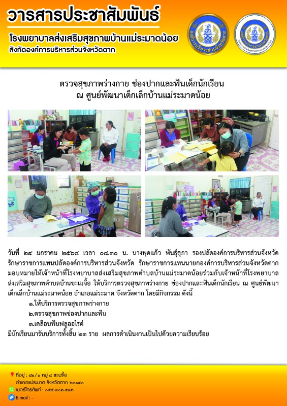 วันที่ ๒๔ มกราคม ๒๕๖๘ เวลา ๐๘.๓๐ น. นางพุดแก้ว พันธุ์สุภา รองปลัดองค์การบริหารส่วนจังหวัด รักษาราชการแทนปลัดองค์การบริหารส่วนจังหวัด รักษาราชการแทนนายกองค์การบริหารส่วนจังหวัดตาก มอบหมายให้เจ้าหน้าที่โรงพยาบาลส่งเสริมสุขภาพตำบลบ้านแม่ระมาดน้อยร่วมกับเจ้าหน้าที่โรงพยาบาลส่งเสริมสุขภาพตำบลบ้านขะเนจื้อให้บริการตรวจสุขภาพร่างกาย ช่องปากและฟันเด็กนักเรียน ณ ศูนย์พัฒนาเด็กเล็กบ้านแม่ระมาดน้อย อำเภอแม่ระมาด จังหวัดตากโดยมีกิจกรรม ดังนี้ ๑.ให้บริการตรวจสุขภาพร่างกาย๒.ตรวจสุขภาพช่องปากและฟัน๓.เคลือบฟันฟลูออไรด์มีนักเรียนมารับบริการทั้งสิ้น ๒๓ ราย ผลการดำเนินงานเป็นไปด้วยความเรียบร้อย