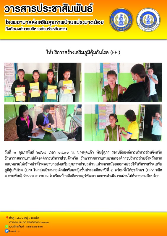 วันที่ ๗ กุมภาพันธ์ ๒๕๖๘ เวลา ๐๘.๓๐ น. นางพุดแก้ว พันธุ์สุภา รองปลัดองค์การบริหารส่วนจังหวัด รักษาราชการแทนปลัดองค์การบริหารส่วนจังหวัด รักษาราชการแทนนายกองค์การบริหารส่วนจังหวัดตาก มอบหมายให้เจ้าหน้าที่โรงพยาบาลส่งเสริมสุขภาพตำบลบ้านแม่ระมาดน้อยออกหน่วยให้บริการสร้างเสริมภูมิคุ้มกันโรค (EPI)ในกลุ่มเป้าหมายเด็กนักเรียนหญิงชั้นประถมศึกษาปีที่ ๕ พร้อมทั้งให้สุขศึกษา (HPV ชนิด ๙ สายพันธ์) จำนวน ๔ ราย ณ โรงเรียนบ้านตือลือราษฎร์พัฒนา ผลการดำเนินงานผ่านไปด้วยความเรียบร้อย