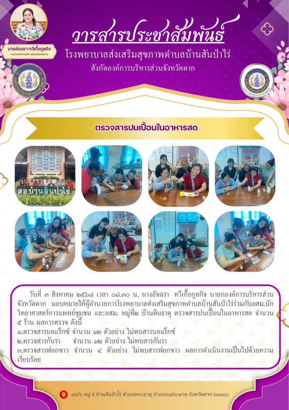 3 สิงหาคม 2568 นายอดิศร เทียนพานิช ผอ.รพ.บ้านสันป่าไร่ ร่วมกับ อสม.นักวิทยาศาสตร์การแพทย์ชุมชนและ อสม. หมู่ที่2 บ้านตีนธาตุ ตรวจสารปนเปื้อนในอาหารสด จำนวน 5 ร้าน ผลการตรวจ ดังนี้1.ตรวจสารบอแร็กซ์ จำนวน 12 ตัวอย่าง ไม่พบสารบอแร็กซ์2.ตรวจสารกันรา จำนวน 12 ตัวอย่าง ไม่พบสารกันรา3.ตรวจสารฟอกขาว จำนวน 4 ตัวอย่าง ไม่พบสารฟอกขาว