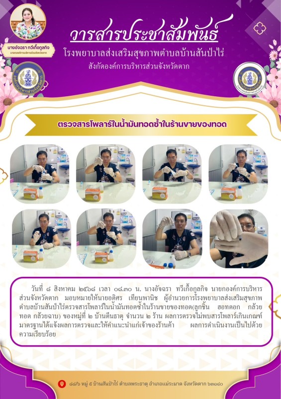 8 สิงหาคม 2568 นายอดิศร เทียนพานิช ผอ.รพ.สต.บ้านสันป่าไร่ ตรวจสารโพลาร์ในน้ำมันทอดซ้ำในร้านขายของทอด(ลูกชิ้น ฮอทดอก กล้วยทอด กล้วยฉาบ) ของหมู่ที่ 2 บ้านตีนธาตุ จำนวน 2 ร้าน ผลการตรวจไม่พบสารโพลาร์เกินเกณฑ์มาตรฐาน ได้แจ้งผลการตรวจและให้คำแนะนำแก่เจ้าของร้านค้า