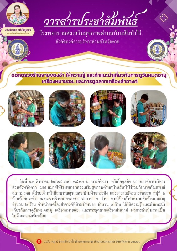 13 สิงหาคม 2568 รพ.สต.บ้านสันป่าไร่ร่วมกับนายกัณตพงศ์ ฉลากมงคล ผู้ช่วยเจ้าหน้าที่สาธารณสุข สสช.บ้านห้วยกระทิงและอาสาสมัครสาธารณสุข ม.6 บ้านห้วยกระทิง ออกตรวจร้านขายของชำ จำนวน 5 ร้าน พบมีร้านค้าจำหน่ายสินค้าหมดอายุ จำนวน 2 ร้าน จำหน่ายเครื่องสำอางค์ที่ห้า
