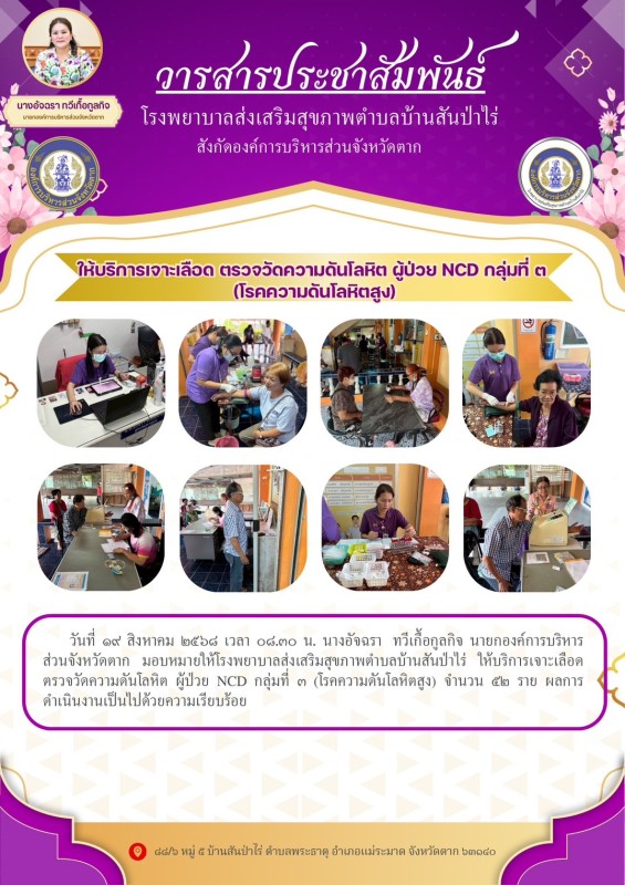 19 ส.ค.68 รพ.สต.บ้านสันป่าไร่ ให้บริการ เจาะเลือด ตรวจวัดความดันโลหิต ผู้ป่วย NCD กลุ่มที่ 3 (โรคความดันโลหิตสูง) จำนวน 52 ราย