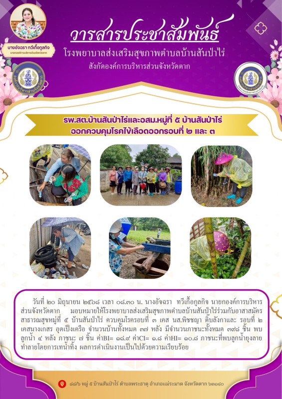 20 มิถุนายน 2568 รพ.สต.บ้านสันป่าไร่ร่วมกับอาสาสมัครสาธารณสุข หมู่ที่ 5 บ้านสันป่าไร่ ควบคุมโรครอบที่ 3 เคส นส.พิชชญา ติ๊บลังกาและ รอบที่ 2 เคสนางเกสร อุดเป็งเครือ จำนวนบ้านทั้งหมด 37 หลัง จำนวนภาชนะทั้งหมด 398 ชิ้น พบลูกน้ำ 4 หลัง ภาชนะ 7 ชิ้น ค่าBI=18.9 ค่าCI=1.8 ค่าHI=10.8 ภาชนะที่พบลูกน้ำยุงลายทำลายโดยการเทน้ำทิ้ง
