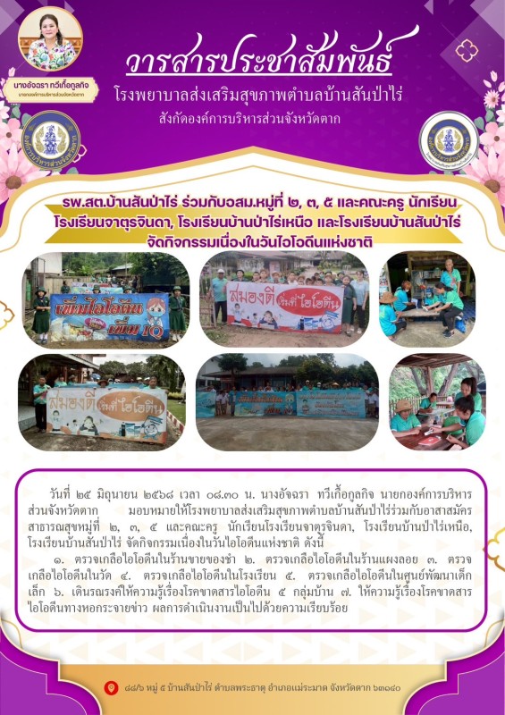 25 มิถุนายน 2568 รพ.สต.บ้านสันป่าไร่ ร่วมกับอาสาสมัครสาธารณสุขหมู่ที่2,3,5และคณะครู นักเรียนโรงเรียนจาตุรจินดา,โรงเรียนบ้านป่าไร่เหนือและโรงเรียนบ้านสันป่าไร่ จัดกิจกรรมเนื่องในวันไอโอดีนแห่งชาติ