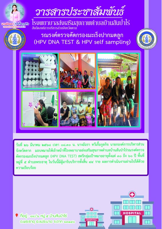26 มี.ค.68 รพ.สต.บ้านสันป่าไร่ รณรงค์ตรวจคัดกรองมะเร็งปากมดลูก สตรีกลุ่มเป้าหมาย อายุ 30 - 60 ปี หมู่ที่ 5 ต.พระธาตุ ด้วยวิธี HPV DNA TEST (ตรวจโดยเจ้าหน้าที่)จำนวน 39 ราย และ วิธี HPV self sampling (ตรวจด้วยตนเอง)จำนวน 5 ราย รวม 44 ราย
