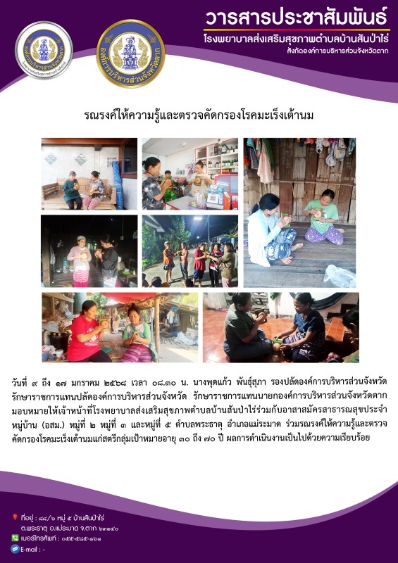 9-17 มกราคม 2568 รพ.สต.บ้านสันป่าไร่ร่วมกับอาสาสมัครสาธารณสุขหมู่ที่2,3และ5 ตำบลพระธาตุ อำเภอแม่ระมาด ร่วมรณรงค์ให้ความรู้และตรวจคัดกรองมะเร็งเต้านมแก่สตรีกลุ่มเป้าหมายอายุ 30-70 ปี