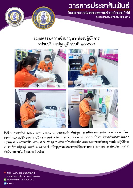 6 ก.พ.68 รพ.สต.บ้านสันป่าไร่ ทดสอบความชำนาญทางห้องปฏิบัติการหน่วยบริการปฐมภูมิ รอบที่ 1/2568 ด้วยวัตถุชุดทดสอบจากศูนย์วิทยาศาสตร์การแพทย์ที่ 2 พิษณุโลก