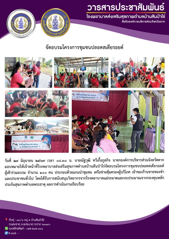 27 มิ.ย.67 รพ.สต.บ้านสันป่าไร่จัดอบรมโครงการชุมชนปลอดสเตียรอยด์ โดยมีผู้เข้าร่วมอบรม จำนวน 100 คน ประกอบด้วยแกนนำชุมชน เครือข่ายคุ้มครองผู้บริโภค เจ้าของร้านขายของชำและประชาชนทั่วไป ณ โรงเรียนบ้านสันป่าไร่ โดยได้รับการสนับสนุนวิทยากรจาก รพ.แม่ระมาดและงบประมาณจากกองทุนหลักประกันสุขภาพตำบลพระธาตุ