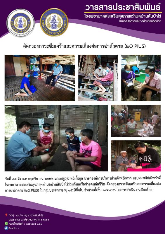 18-25 พย. 66 รพ.สต.บ้านสันป่าไร่ร่วมกับเครือข่ายคนต่อชีวิต คัดกรองภาวะซึมเศร้าและความเสี่ยงต่อการฆ่าตัวตาย(2Q PIUS) ในประชากร อายุ 15 ปี ขึ้นไป จำนวน 1424 คน