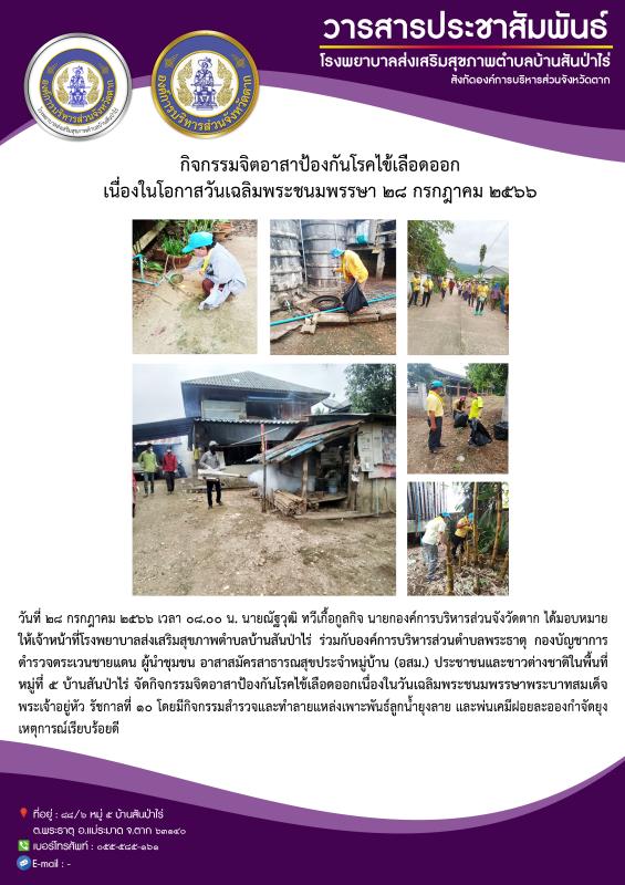 28 ก.ค. 66 จนท.รพ.สต.บ้านสันป่าไร่ร่วมกับผู้นำชุมชน อสม. ,ประชาชนและชาวต่างชาติในพื้นที่หมู่ที่ 5 บ้านสันป่าไร่ รวมทั้งส่วนราชการในพื้นที่ ( อบต.พระธาตุและตชด.) จัดกิจกรรมจิตอาสา ป้องกันโรคไข้เลือดออก เนื่องในวันเฉลิมพระชนมพรรษา พระบาทสมเด็จพระเจ้าอยู่หัว