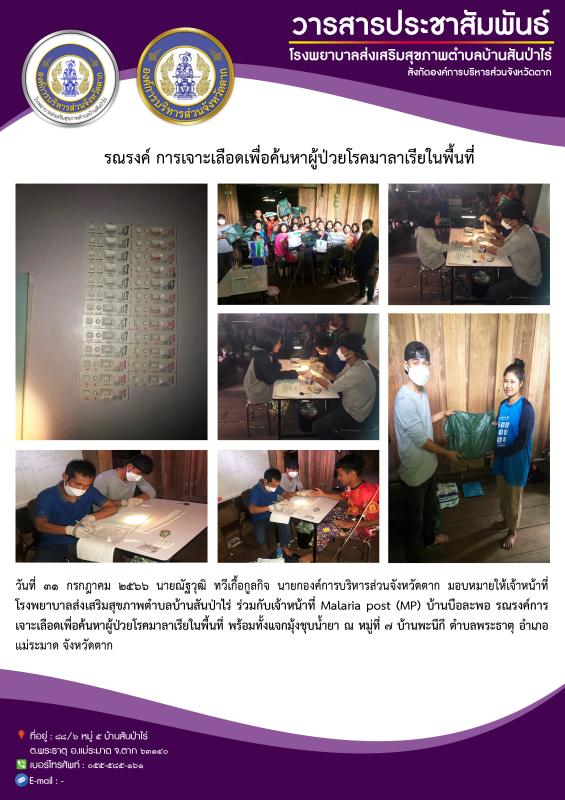 31 ก.ค. 66 จนท.รพ.สต.บ้านสันป่าไร่ร่วมกับจนท.MP บ้านบือละพอ รณรงค์เจาะเลือดเพื่อค้นหาผู้ป่วยโรคมาลาเรียพร้อมทั้งแจกมุ้งชุบน้ำยาที่ ม.7 บ้านพะนิกรี
