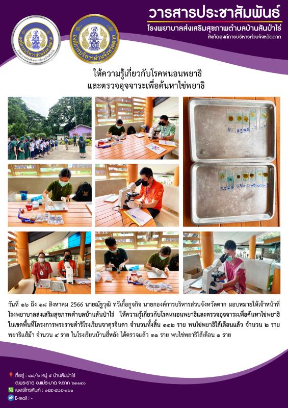 16-18 ส.ค. 66 จนท.รพ.สต.บ้านสันป่าไร่ ให้ความรู้เกี่ยวกับโรคหนอนพยาธิและตรวจอุจจาระเพื่อค้นหาไข่พยาธิในพื้นที่โครงการพระราชดำริโรงเรียนจาตุรจินดา จำนวน 112 คนพบไข่พยาธิไส้เดือน 2 คน แส้ม้า 4 คนและโรงเรียนบ้านสี่หลัง จำนวน 31 คน พบไข่พยาธิไส้เดือน 1 คน