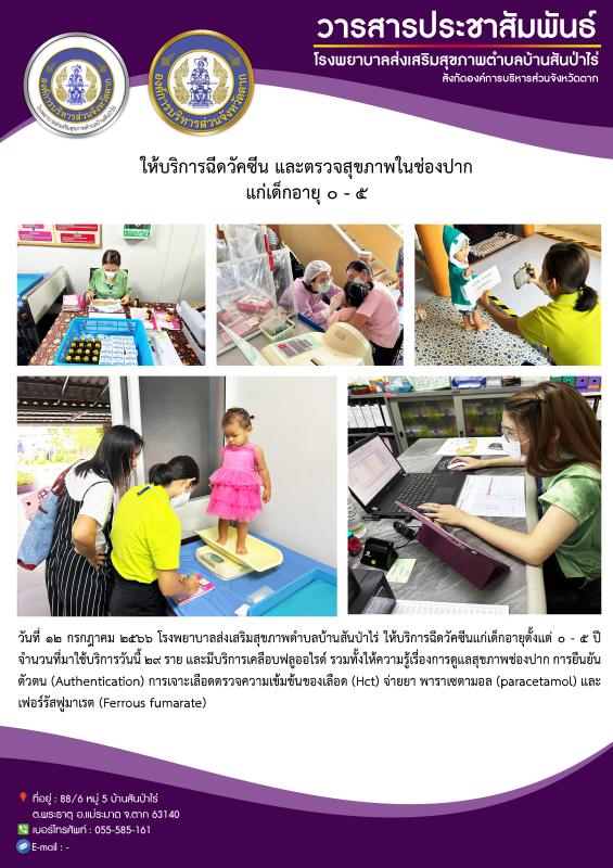 12 ก.ค.66 รพ.สต.บ้านสันป่าไร่ ให้บริการฉีดวัคซีนเด็กอายุ 0-5 ปี จำนวน 29 ราย และมีบริการเคลือบฟลูออไรด์/ให้ความรู้เรื่องการดูแลสุขภาพช่องปาก , การยืนยันตัวตน(Authentication) , เจาะเลือดตรวจความเข้มข้นของเลือด(Hct) , จ่ายยา Para syr/Ferrous syr