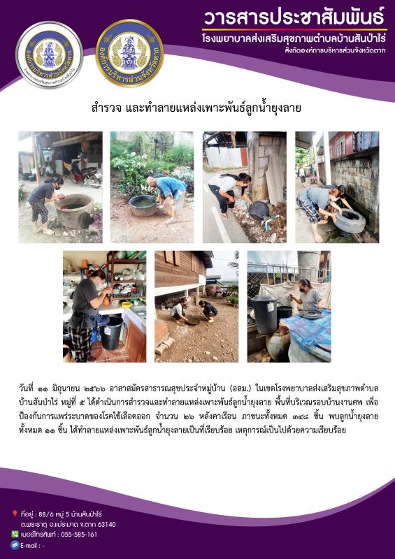 11 มิ.ย. 66 อาสาสมัครสาธารณสุขหมู่ที่5 บ้านสันป่าไร่ สำรวจและทำลายแหล่งเพาะพันธ์ลูกน้ำยุงลาย รอบบ้านงานศพ 100 เมตร