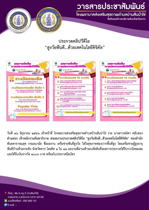 16 มิ.ย.66 จนท.รพ.สต.บ้านสันป่าไร่ นส.พนิดา ตลับทอง จพ.ทันตาภิบาล ส่งผลงานประกวดคลิปวิดิโอ”สูงวัยฟันดี…ด้วยเทคโนโลยีดิจิทัล” ของสำนักทันตสาธารณสุข กรมอนามัย ชื่อผลงาน เครือข่ายฟันดีสูงวัย ใส่ใจสุขภาพช่องปากพื้นที่สูง โดยเครือข่ายผู้สูงอายุ ฟันดีบ้านห้วยกระทิง จ.ตาก โดยติด 1 ใน 13 ผลงานที่ผ่านเข้ารอบตัดสิน ซึ่งผลการประกวดได้รับรางวัลชมเชย ได้รับเงินรางวัล 1000 บาทพร้อมใบประกาศนียบัตร