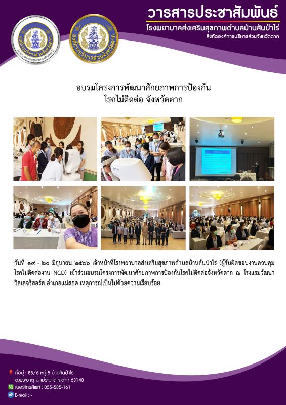 19-20 มิ.ย.66 จนท.รพ.สต.บ้านสันป่าไร่ (ผรช.งาน NCD) เข้าร่วมอบรมโครงการพัฒนาศักยภาพการป้องกันโรคไม่ติดต่อ จังหวัดตาก ณ โรงแรมวัฒนาวิลเลจรีสอร์ท อำเภอแม่สอด