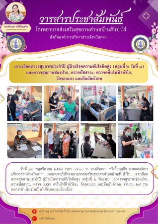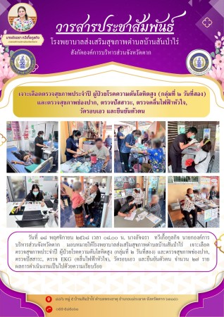 17 พ.ย.2568 (08.00น.) รพ.สต.บ้านสันป่าไร่ เจาะเลือดตรวจสุขภาพประจำปี ผู้ป่วยโรคความดันโลหิตสูง (กลุ่มที่ 2 วันแรก) และ ตรวจสุขภาพช่องปาก , ตรวจปัสสาวะ , ตรวจ EKG (คลื่นไฟฟ้าหัวใจ) , วัดรอบเอว และ ยืนยันตัวตน จำนวน 27 ราย