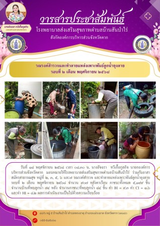18 พฤศจิกายน 2568 นางอัจฉรา ทวีเกื้อกูลกิจ นายกองค์การบริหารส่วนจังหวัดตาก มอบหมายให้ รพ.สต.บ้านสันป่าไร่ ร่วมกับ อาสาสมัครสาธารณสุข หมู่ที่ 2,3,5,6และ7 รณรงค์สำรวจและทำลายแหล่งเพาะพันธ์ลูกน้ำยุงลาย รอบที่ 2 เดือน พฤศจิกายน 2568 จำนวน 907 หลังคาเรือน ภาชนะทั้งหมด 5199 ชิ้น จำนวนบ้านที่พบลูกน้ำ 74 หลัง จำนวนภาชนะที่พบลูกน้ำ 84 ชิ้น ค่าBI=9.3 ค่าCI=1.6 และค่าHI=8.2