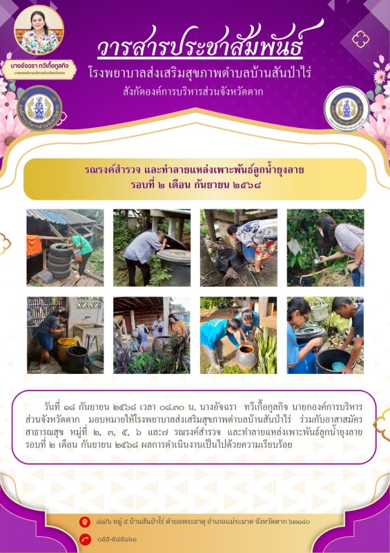 18 กันยายน 2568 นางอัจฉรา ทวีเกื้อกูลกิจ นายกองค์การบริหารส่วนจังหวัดตาก มอบหมายให้ รพ.สต.บ้านสันป่าไร่ ร่วมกับ อาสาสมัครสาธารณสุข หมู่ที่ 2,3,5,6และ7 รณรงค์สำรวจและทำลายแหล่งเพาะพันธ์ลูกน้ำยุงลาย รอบที่ 2 เดือน กันยายน 2568