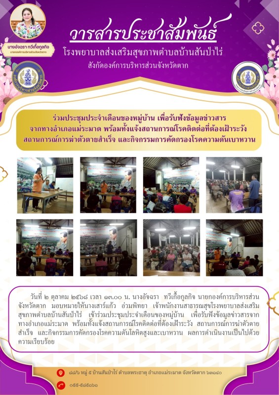2 ตุลาคม 2568 นางอัจฉรา ทวีเกื้อกูลกิจ นายกองค์การบริหารส่วนจังหวัดตาก มอบหมายให้ นางเสาร์แก้ว อ่วมพิทยา เจ้าพนักงานสาธารณสุข รพ.สต.บ้านสันป่าไร่ เข้าร่วมประชุมประจำเดือนของหมู่บ้าน เพื่อรับฟังข้อมูลข่าวสารจากทางอำเภอแม่ระมาด พร้อมทั้งแจ้งสถานการณ์โรคติดต่อที่ต้องเฝ้าระวัง สถานการณ์การฆ่าตัวตายสำเร็จ และกิจกรรมการคัดกรองโรคความดันโลหิตสูงและเบาหวาน