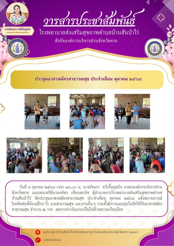 3 ตุลาคม 2568 นางอัจฉรา ทวีเกื้อกูลกิจ นายกองค์การบริหารส่วนจังหวัดตาก มอบหมายให้ นายอดิศร เทียนพานิช ผอ.รพ.สต.บ้านสันป่าไร่ จัดประชุมอาสาสมัครสาธารณสุข ประจำเดือน ตุลาคม 2568 แจ้งสถานการณ์โรคติดต่อที่ต้องเฝ้าระวัง งานสาธารณสุขอื่นๆ และงานอื่น รวมทั้งมีกา