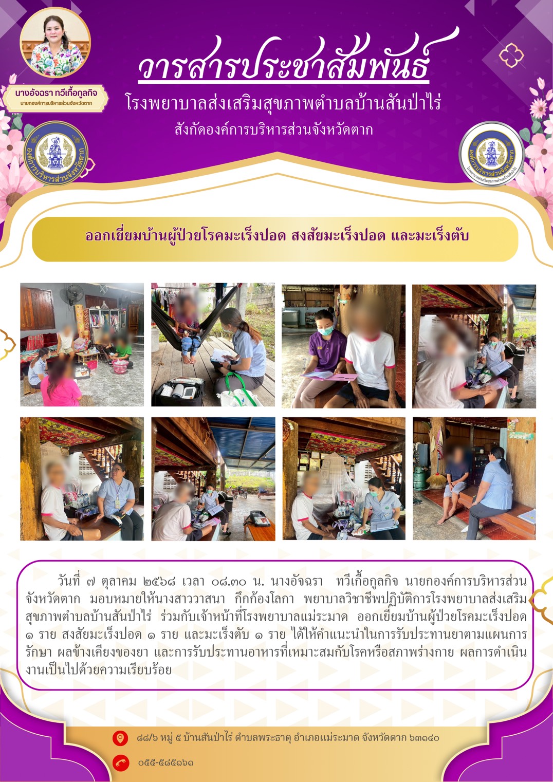 7 ตุลาคม 2568 นางอัจฉรา ทวีเกื้อกูลกิจ นายกองค์การบริหารส่วนจังหวัดตาก มอบหมายให้ นางสาววาสนา กึกก้องโลกา พยาบาลวิชาชีพปฏิบัติการ รพ.สต.บ้านสันป่าไร่ ร่วมกับ จนท.รพ.แม่ระมาด ออกเยี่ยมบ้านผู้ป่วยโรคมะเร็งปอด 1 ราย สงสัยมะเร็งปอด 1 ราย และมะเร็งตับ 1 ราย ได้ให้คำแนะนำในการรับประทานยาตามแผนการรักษา ผลข้างเคียงของยา และการรับประทานอาหารที่เหมาะสมกับโรคหรือสภาพร่างกาย