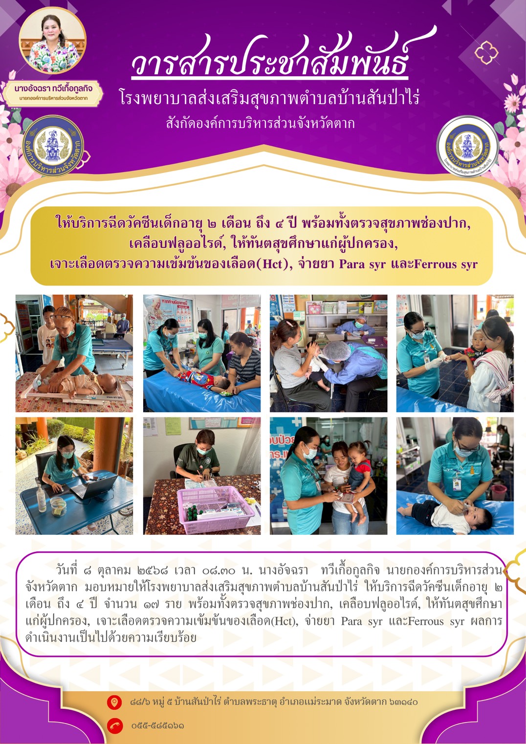 8 ต.ค.68 รพ.สต.บ้านสันป่าไร่ ให้บริการฉีดวัคซีนเด็กอายุ 2 เดือน ถึง 4 ปี จำนวน 17 ราย พร้อมทั้งตรวจสุขภาพช่องปาก , เคลือบฟลูออไรด์ , ให้ทันตสุขศึกษาแก่ผู้ปกครอง , เจาะเลือดตรวจความเข้มข้นของเลือด(Hct) , จ่ายยา Para syr และ Ferrous syr