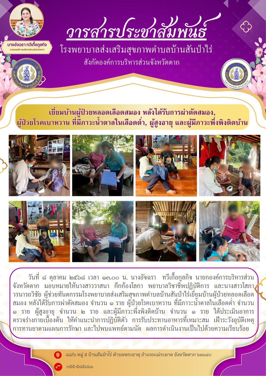 8 ตุลาคม 2568 นางอัจฉรา ทวีเกื้อกูลกิจ นายกองค์การบริหารส่วนจังหวัดตาก มอบหมายให้ นางสาววาสนา กึกก้องโลกา พยาบาลวิชาชีพปฏิบัติการ และนางสาวโสภา วรนารถวิชัย ผู้ช่วยทันตกรรม รพ.สต.บ้านสันป่าไร่ เยี่ยมบ้านผู้ป่วยหลอดเลือดสมอง หลังได้รับการผ่าตัดสมอง จำนวน 1