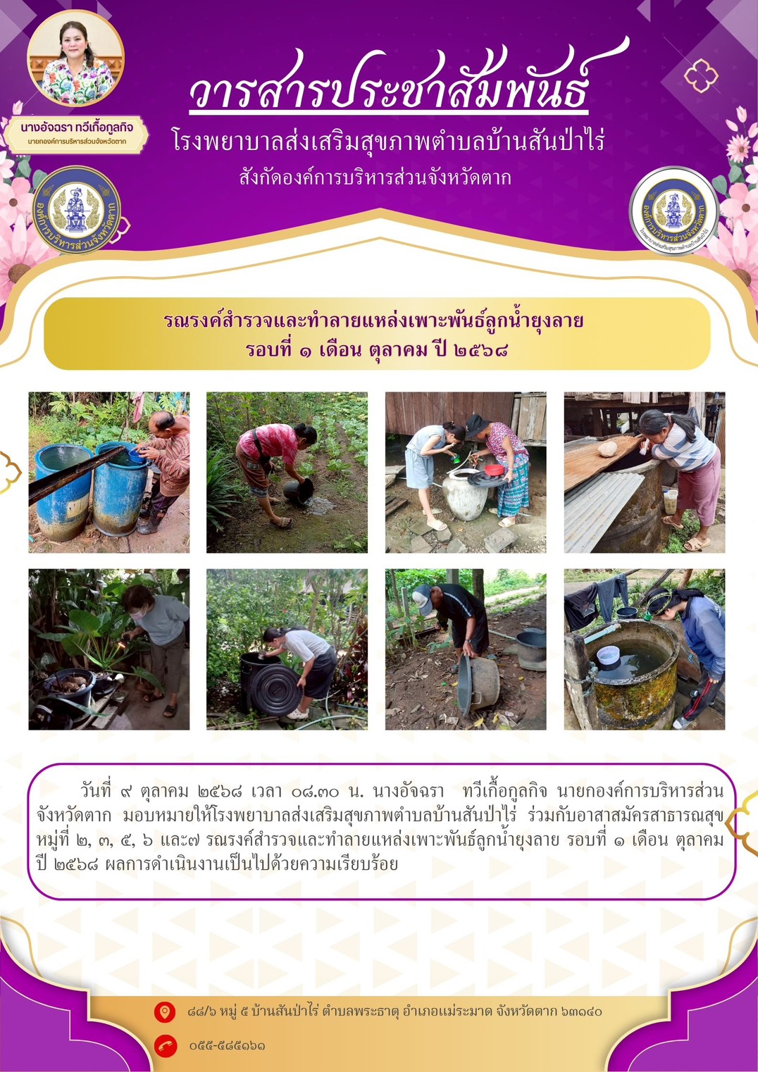 9 ตุลาคม 2568 นางอัจฉรา ทวีเกื้อกูลกิจ นายกองค์การบริหารส่วนจังหวัดตาก มอบหมายให้ รพ.สต.บ้านสันป่าไร่ ร่วมกับอาสาสมัครสาธารณสุขหมู่ที่ 2,3,5,6และ7 รณรงค์สำรวจและทำลายแหล่งเพาะพันธ์ลูกน้ำยุงลาย รอบที่ 1 เดือน ตุลาคม 2568