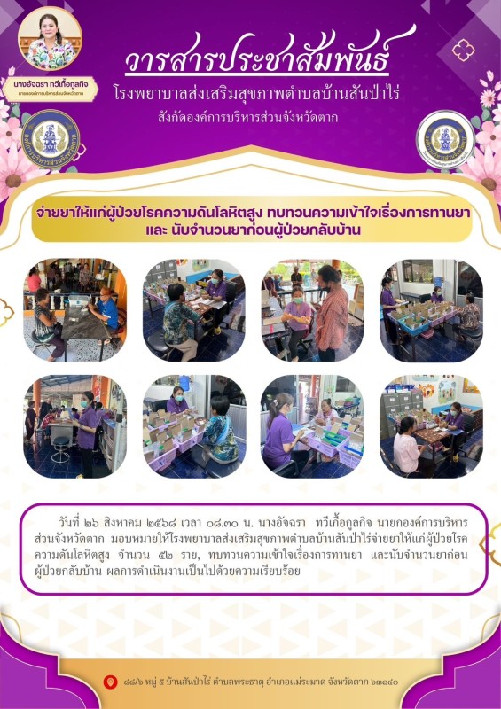 26 ส.ค.68 รพ.สต.บ้านสันป่าไร่ จ่ายยาให้แก่ผู้ป่วยโรคความดันโลหิตสูง จำนวน 52 ราย , ทบทวนความเข้าใจเรื่องการทานยา และ นับจำนวนยาก่อนผู้ป่วยกลับบ้าน