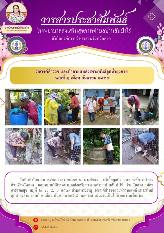 9 กันยายน 2568 นางอัจฉรา ทวีเกื้อกูลกิจ นายกองค์การบริหารส่วนจังหวัดตาก มอบหมายให้ รพ.สต.บ้านสันป่าไร่ ร่วมกับ อาสาสมัครสาธารณสุข หมู่ที่ 2,3,5,6และ7 ตำบลพระธาตุ รณรงค์สำรวจและทำลายแหล่งเพาะพันธ์ลูกน้ำยุงลาย รอบที่ 1 เดือน กันยายน 2568