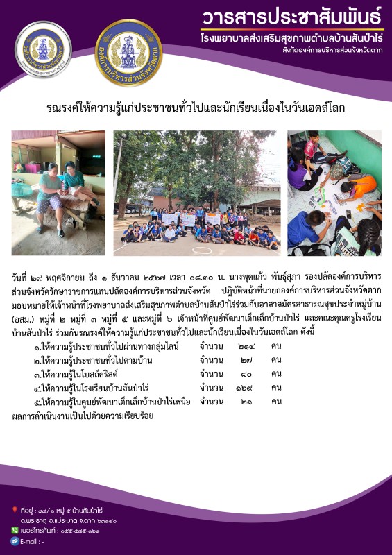 29-30 พ.ย.และ1 ธ.ค. 67 จนท.รพ.สต.บ้านสันป่าไร่ ร่วมกับอาสาสมัครสาธารณสุขหมู่ที่2,3,5และ6,ศพด.บ้านป่าไร่เหนือและโรงเรียนบ้านสันป่าไร่ รณรงค์ให้ความรู้แก่ประชาชนทั่วไปและนักเรียนเนื่องในวันเอดส์โลก ดังนี้1.ให้ความรู้ประชาชนทั่วไปผ่านทางกลุ่มไลน์ จำนวน 214 คน2.ให้ความรู้ประชาชนทั่วไปตามบ้าน จำนวน 27 คน3.ให้ความรู้ในโบสถ์คริสต์ จำนวน 80 คน4.ให้ความรู้ในโรงเรียนบ้านสันป่าไร่ จำนวน 169 คน5.ให้ความรู้ในศพด.บ้านป่าไร่เหนือ จำนวน 21 คน