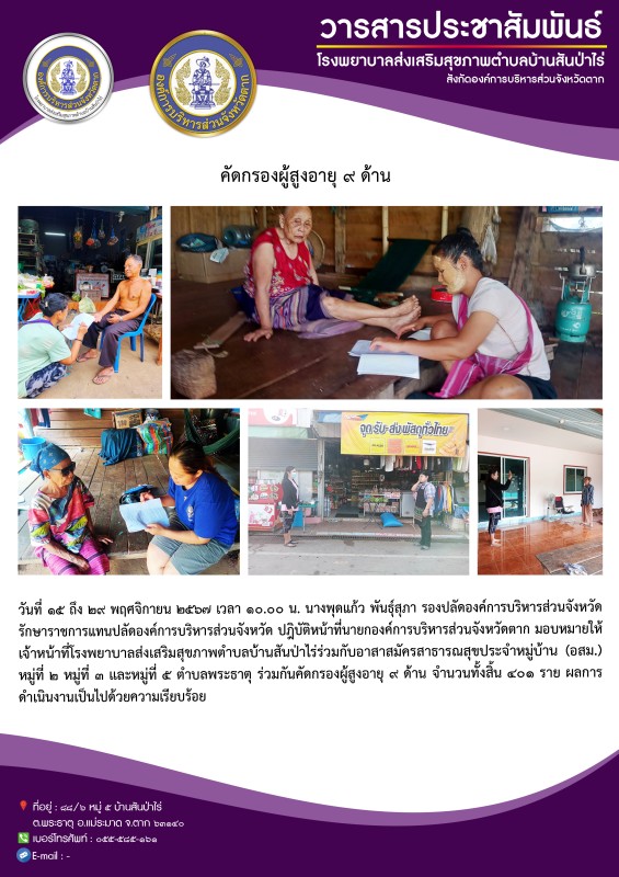 15-29 พฤศจิกายน 67 รพ.สต.บ้านสันป่าไร่ ร่วมกับอาสาสมัครสาธารณสุขหมู่ที่2,3และ5 ตำบลพระธาตุ คัดกรองผู้สูงอายุ 9 ด้าน จำนวน 401 คน