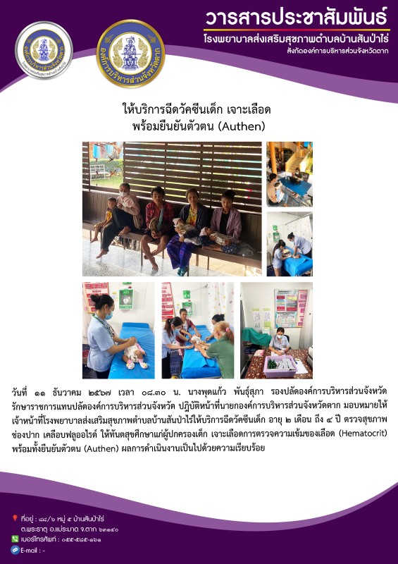 11 ธ.ค.67 รพ.สต.บ้านสันป่าไร่ ให้บริการฉีดวัคซีนเด็ก อายุ 2 เดือน ถึง 4 ปี ตรวจสุขภาพช่องปาก เจาะเลือดเพื่อตรวจหาความเข้มข้นเลือด และยืนยันตัวตน