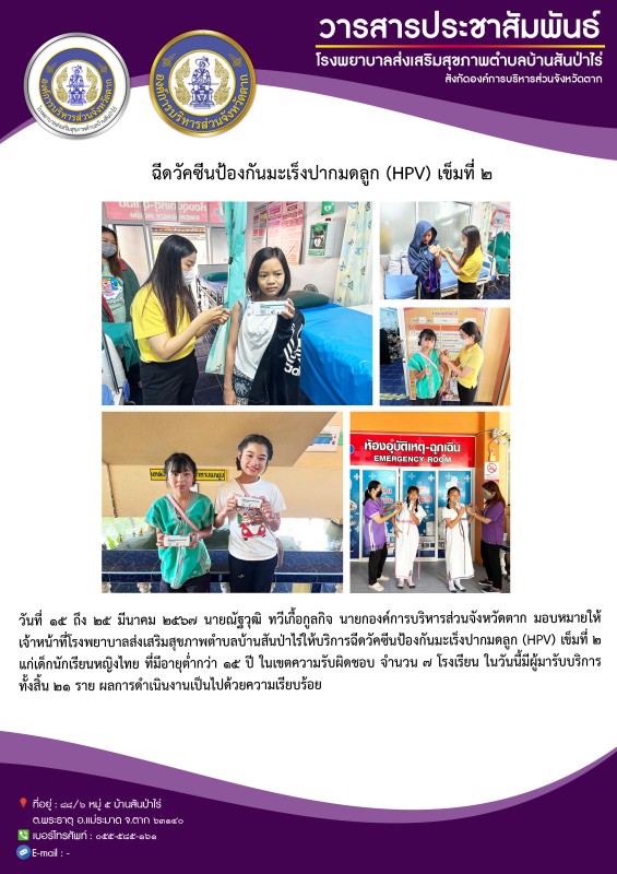 วันที่ 15 - 25 มี.ค.67 รพ.สต.บ้านสันป่าไร่ ทยอยฉีดวัคซีนป้องกันมะเร็งปากมดลูก( HPV ) เข็ม 2 ให้นักเรียนหญิงไทยอายุต่ำกว่า 15 ปี ในเขตรับผิดชอบ 7 โรงเรียน จำนวนรวมทั้งหมด 21 ราย ครบเรียบร้อยแล้ว