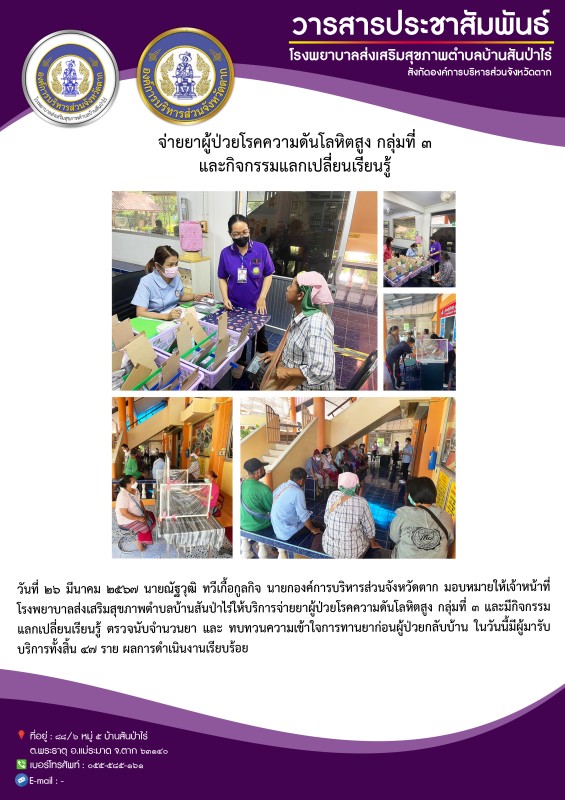 26 มี.ค.67 รพ.สต.บ้านสันป่าไร่ จ่ายยาผู้ป่วยโรคความดันโลหิตสูง กลุ่มที่ 3 จำนวน 47 ราย และมีกิจกรรมแลกเปลี่ยนเรียนรู้ , ตรวจนับจำนวนยา และ ทบทวนความเข้าใจการทานยาก่อนผู้ป่วยกลับบ้าน