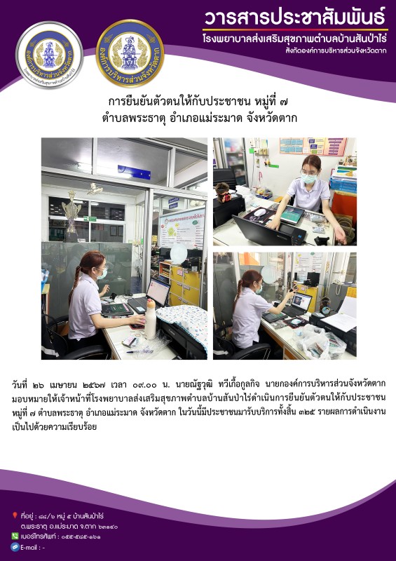 26 เม.ย.67 รพ.สต.บ้านสันป่าไร่ ดำเนินการยืนยันตัวตน ประชาชน หมู่ 7 ต.พระธาตุ จำนวน 325 คน