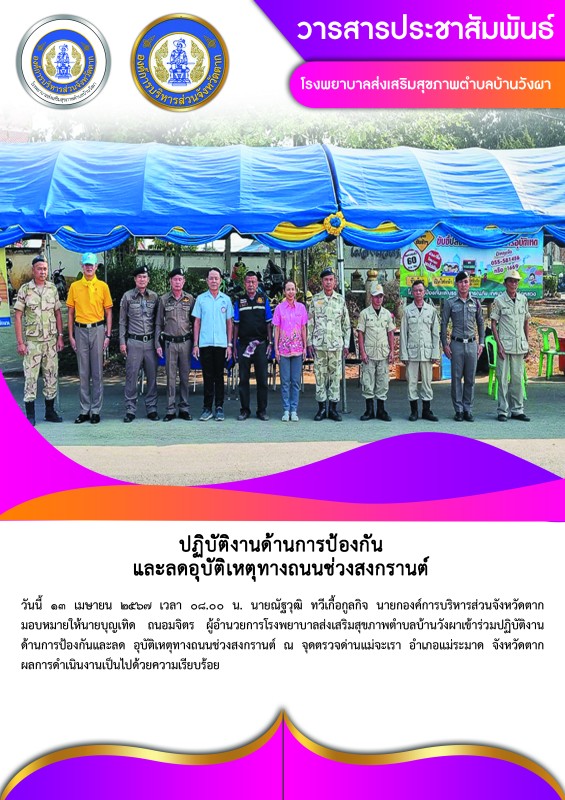 วันนี้ ๑๓ เมษายน ๒๕๖๗ เวลา ๐๘.๐๐ น. นายณัฐวุฒิ ทวีเกื้อกูลกิจ นายกองค์การบริหารส่วนจังหวัดตาก มอบหมายให้นายบุญเทิด ถนอมจิตร ผู้อำนวยการโรงพยาบาลส่งเสริมสุขภาพตำบลบ้านวังผาร่วมปฏิบัติงานด้านการป้องกันและลด อุบัติเหตุทางถนนช่วงสงกรานต์ ณ จุดตรวจด่านแม่จะเรา อำเภอแม่ระมาด จังหวัดตากผลการดำเนินงานเป็นไปด้วยความเรียบร้อย