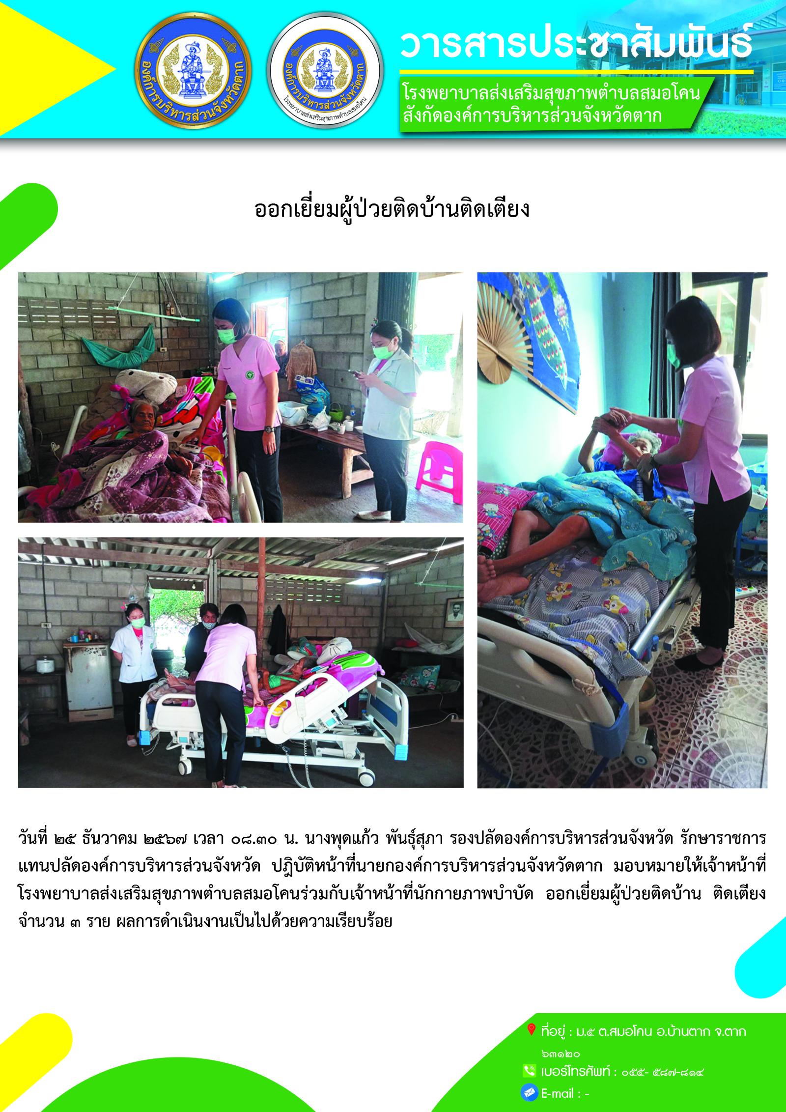 วันที่ ๒๕ ธันวาคม ๒๕๖๗ เวลา ๐๘.๓๐ น. นางพุดแก้ว พันธุ์สุภา รองปลัดองค์การบริหารส่วนจังหวัด รักษาราชการแทนปลัดองค์การบริหารส่วนจังหวัด ปฎิบัติหน้าที่นายกองค์การบริหารส่วนจังหวัดตาก มอบหมายให้เจ้าหน้าที่โรงพยาบาลส่งเสริมสุขภาพตำบลสมอโคนร่วมกับเจ้าหน้าที่นักกายภาพบำบัด