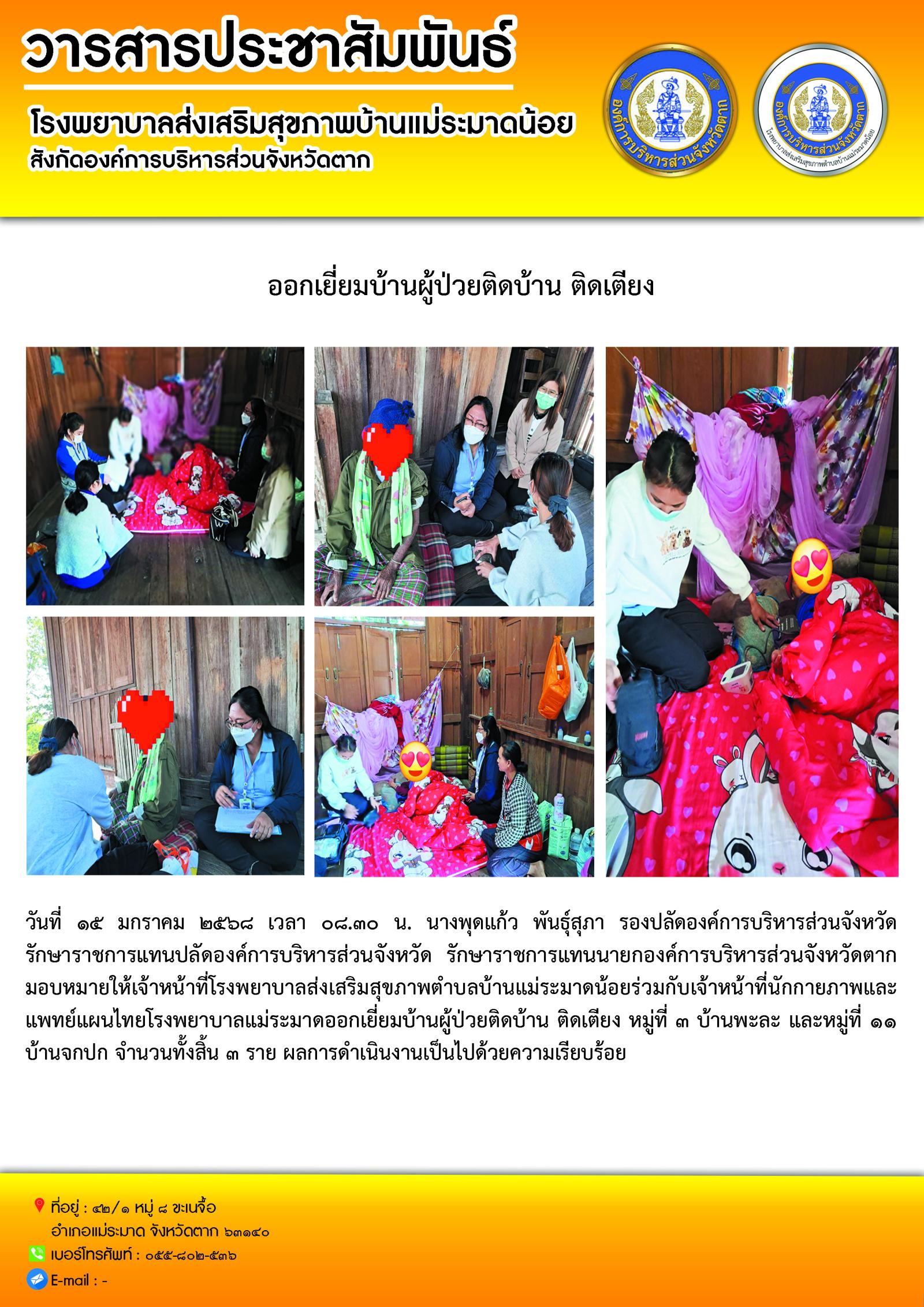 โรงพยาบาลแม่ระมาดออกเยี่ยมบ้านผู้ป่วยติดบ้าน ติดเตียง หมู่ที่ ๓ บ้านพะละ และหมู่ที่ ๑๑ บ้านจกปก