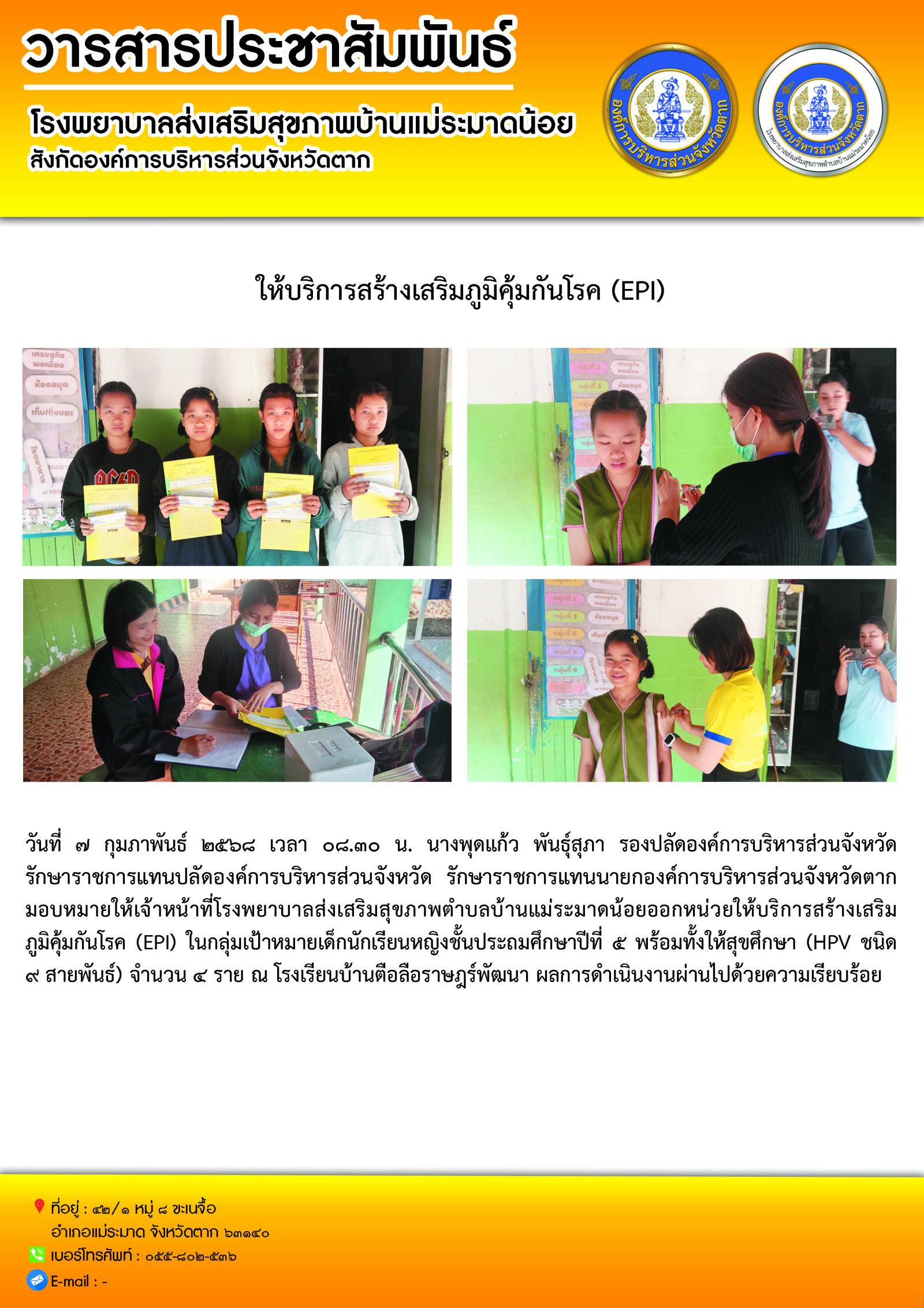 เจ้าหน้าที่โรงพยาบาลส่งเสริมสุขภาพตำบลบ้านแม่ระมาดน้อยออกหน่วยให้บริการสร้างเสริมภูมิคุ้มกันโรค (EPI)