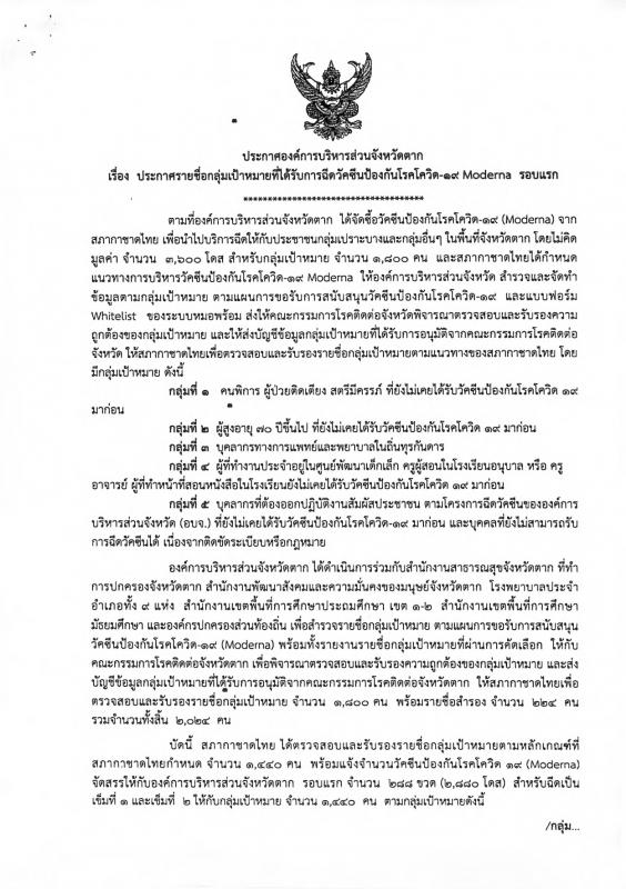 แจ้งข่าวประชาสัมพันธ์ ประกาศรายชื่อกลุ่มเป้าหมายที่ได้รับการฉีดวัคซีนป้องกันโรคโควิด-19 (Moderna) #รอบแรก โดยรายชื่อผู้ที่ได้รับการฉีดวัคซีนจะแบ่งออกเป็นรายอำเภอ พร้อมทั้งรายชื่อผู้ที่ไม่ผ่านเกณฑ์ #สามารถตรวจสอบรายชื่อได้จากลิงค์ที่แนบมานี้ ทั้งนี้ท่านสามารถตรวจสอบรายชื่อได้จากช่องทางขององค์การบริหารส่วนจังหวัดตาก และโรงพยาบาลประจำอำเภอทั้ง 9 แห่ง สอบถามรายละเอียดเพิ่มเติมได้ที่หมายเลขโทรศัพท์ 0-5551-8333 และ 0-5551-8323 สำหรับวันและเวลาการให้บริการฉีดวัคซีนของแต่ละอำเภอ ทางโรงพยาบาลหน่วยฉีดจะแจ้งให้ทราบต่อไป