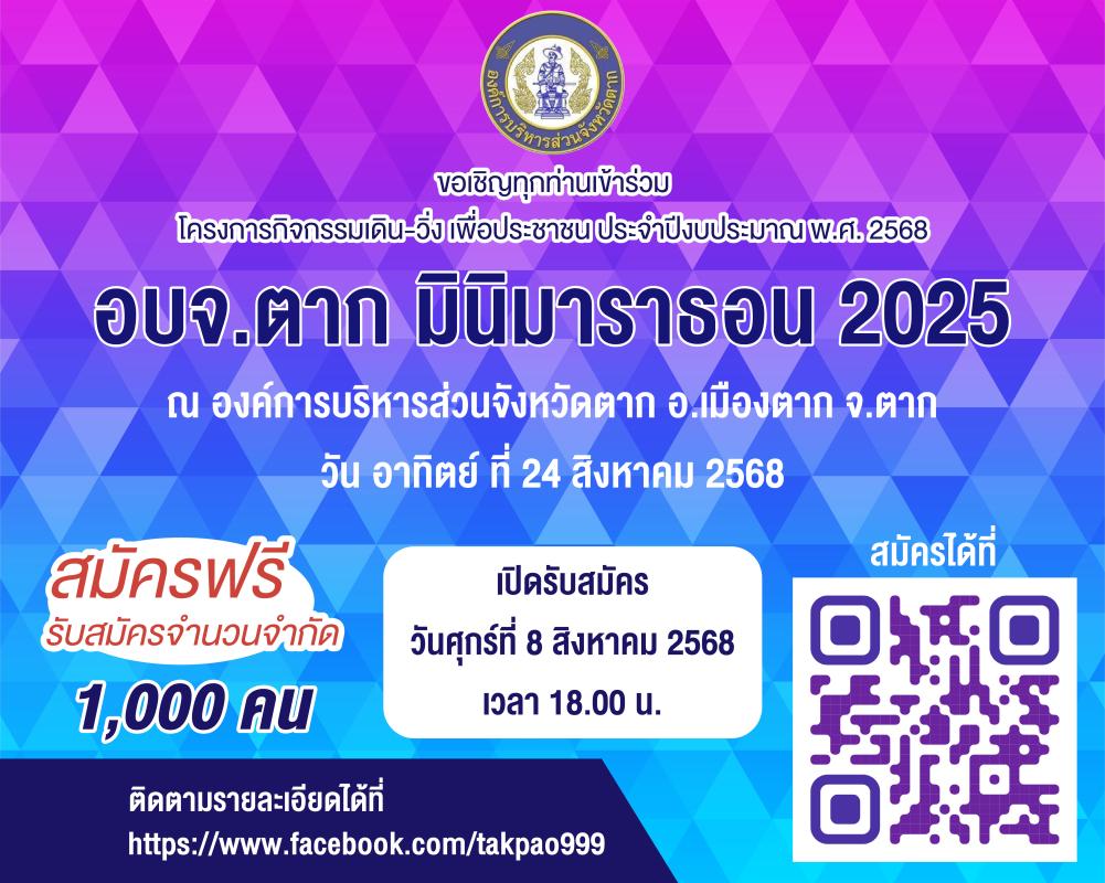ขอเชิญเข้าร่วม โครงการกิจกรรมเดิน-วิ่ง เพื่อประชาชน ประจำปีงบประมาณ พ.ศ. 2568 “อบจ.ตาก มินิมาราธอน 2025”