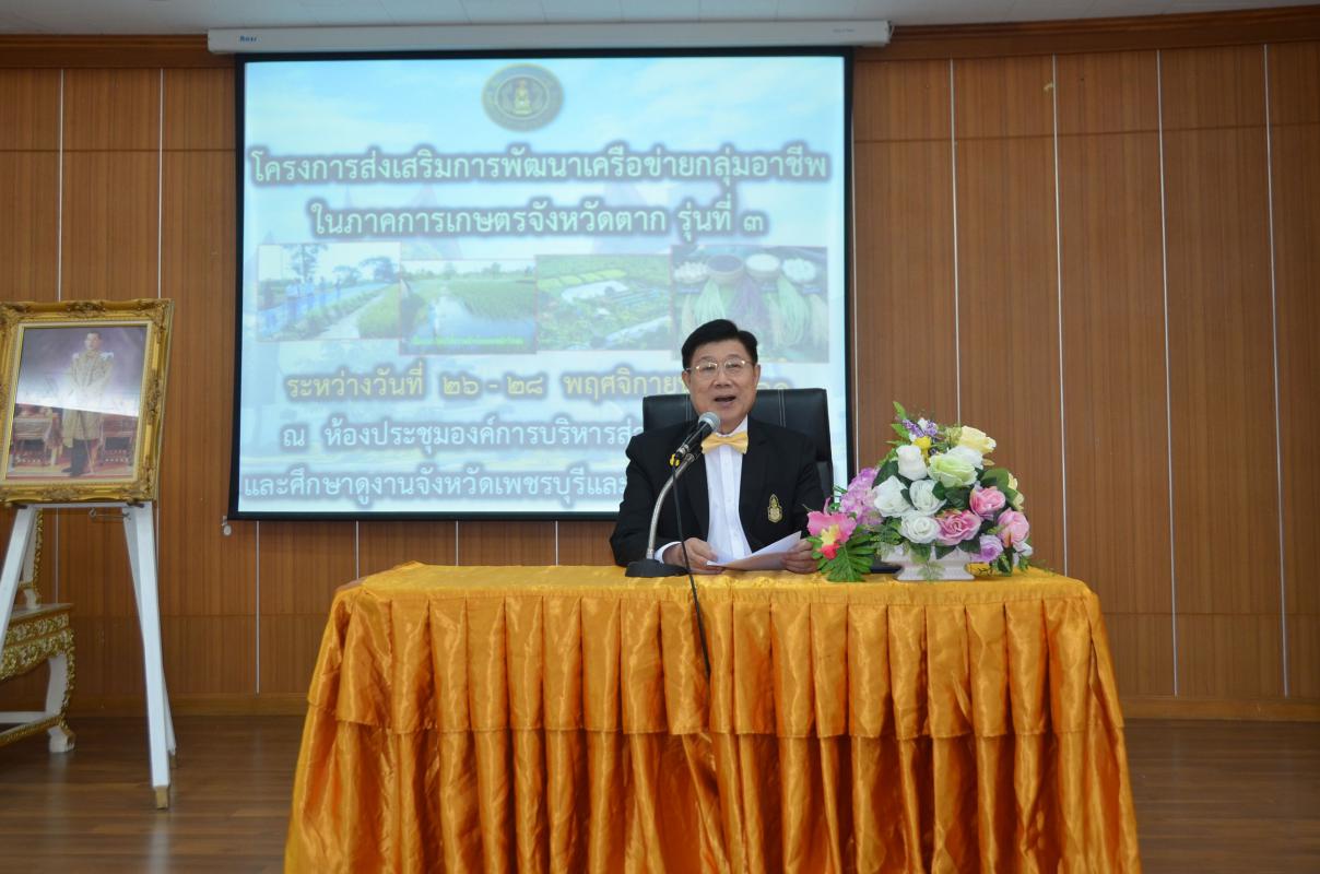 วันที่ 26 พฤศจิกายน พ.ศ.2561 นายณัฐวุฒิ ทวีเกื้อกูลกิจ นายกองค์การบริหารส่วนจังหวัดตาก เป็นประธานเปิดโครงการส่งเสริมการพัฒนาเครือข่ายกลุ่มอาชีพในภาคการเกษตรจังหวัดตาก ประจำปีงบประมาณ 2562 รุ่นที่ 3 ซึ่งมีกำหนดการจัดโครงการระหว่างวันที่ 26 - 28 พฤศจิกายน 2561 ณ ห้องประชุมองค์การบริหารส่วนจังหวัดตาก และศึกษาดูงาน ณ จังหวัดเพชรบุรี และจังหวัดสุพรรณบุรี โดยมีนายเจริญ สุต๋า สมาชิกสภาองค์การบริหารส่วนจังหวัดตาก เขตอำเภอแม่สอด เขต6 กล่าวรายงาน และได้รับเกียรติจากนายวิวัฒน์ สังวาลย์ นักวิชาการส่งเสริมการเกษตรปฏิบัติการ สำนักงานเกษตรจังหวัดตาก มาเป็นวิทยากรบรรยายให้ความรู้ วัตถุประสงค์ในการจัดโครงการนี้ เพื่อเสริมสร้างความเข้มแข็งของกลุ่มเกษตรกร/เครือข่ายกลุ่มอาชีพในภาคการเกษตร และส่งเสริมให้ประชาชนได้พัฒนาความรู้ ทักษะ ในการประกอบอาชีพ มีกลุ่มเป้าหมายเป็นเกษตรกรจากอำเภอแม่สอด เข้าร่วมจำนวน 100 คน