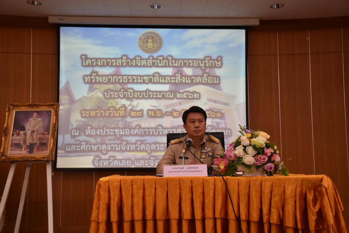 วันที่ 29 พฤศจิกายน พ.ศ.2561 นายภาคภูมิ บูลย์ประมุข รองนายกองค์การบริหารส่วนจังหวัดตาก ได้รับมอบหมายจากนายณัฐวุฒิ ทวีเกื้อกูลกิจ นายกองค์การบริหารส่วนจังหวัดตาก เป็นประธานเปิดโครงการสร้างจิตสำนึกในการอนุรักษ์ทรัพยากรธรรมชาติและสิ่งแวดล้อม ประจำปีงบประมาณ 2562 ซึ่งมีกำหนดการจัดโครงการระหว่างวันที่ 29 พฤศจิกายน - 2 ธันวาคม 2561 ณ ห้องประชุมองค์การบริหารส่วนจังหวัดตาก และศึกษาดูงาน ณ จังหวัดอุดรธานี จังหวัดหนองคาย จังหวัดเลย และจังหวัดเพชรบูรณ์ โดยมีนางสาวธันยพัฒน์ ตุ้นทรัพย์ สมาชิกสภาองค์การบริหารส่วนจังหวัดตาก เขตอำเภอเมืองตาก เขต1 กล่าวรายงาน และได้รับเกียรติจากบุคลากร สำนักจัดการทรัพยากรป่าไม้ที่ 4 จังหวัดตาก มาเป็นวิทยากรบรรยายให้ความรู้ วัตถุประสงค์ในการจัดโครงการนี้ เพื่อให้เยาวชน ประชาชน สามารถพัฒนาศักยภาพของตนเอง และสามารถนำความรู้ที่ได้รับไปเผยแพร่ให้กับครอบครัว โรงเรียน และชุมชนต่อไป มีกลุ่มเป้าหมายเป็นประชาชนในจังหวัดตาก เข้าร่วมจำนวน 90 คน