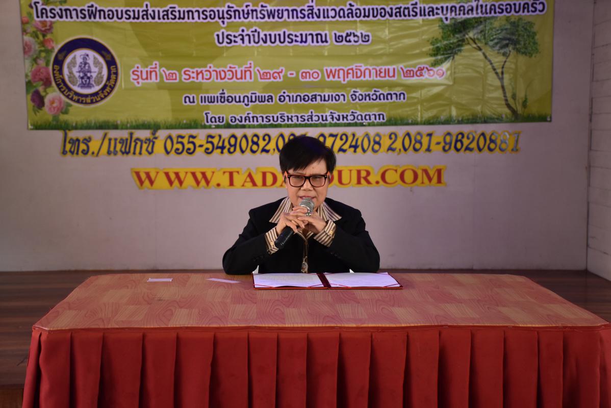 วันที่ 29 พฤศจิกายน พ.ศ.2561 นางสาวอรุณวรรษา ยมเกิด เลขานุการนายกองค์การบริหารส่วนจังหวัดตาก ได้รับมอบหมายจากนายณัฐวุฒิ ทวีเกื้อกูลกิจ นายกองค์การบริหารส่วนจังหวัดตาก เป็นประธานเปิดโครงการฝึกอบรมส่งเสริมการอนุรักษ์ทรัพยากรสิ่งแวดล้อมของสตรีและบุคคลในครอบครัว ประจำปีงบประมาณ 2562 รุ่นที่ 2 ซึ่งมีกำหนดการจัดโครงการระหว่างวันที่ 29 - 30 พฤศจิกายน 2561 ณ เขื่อนภูมิพล อำเภอสามเงา จังหวัดตาก โดยมีนายพิพัฒชัย แก้วสีเขียว สมาชิกสภาองค์การบริหารส่วนจังหวัดตาก เขตอำเภอเมืองตาก เขต4 กล่าวรายงาน และได้รับเกียรติจาก ร.ต. สาโรช ชัยชนะ มาเป็นวิทยากรบรรยายให้ความรู้ วัตถุประสงค์ในการจัดโครงการนี้ เพื่อปลูกฝังให้สตรี และบุคคลในครอบครัว ชุมชน มีจิตสำนึกในการรู้จักใช้ทรัพยากร ที่มีอยู่ให้เกิดประโยชน์ถูกต้องและคุ้มค่ามากที่สุด มีกลุ่มเป้าหมายเป็นสตรีและประชาชนในจังหวัดตากเข้าร่วมจำนวน 200 คน