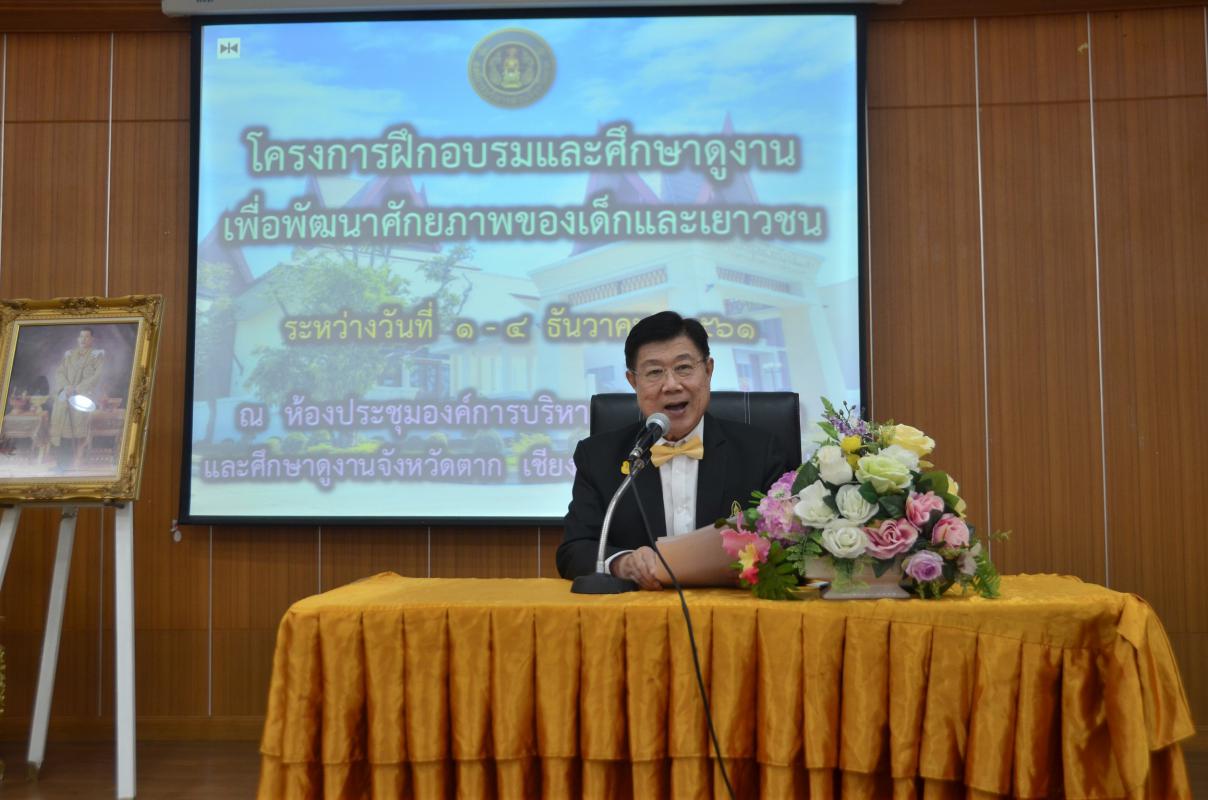 วันที่ 1 ธันวาคม พ.ศ.2561 นายณัฐวุฒิ ทวีเกื้อกูลกิจ นายกองค์การบริหารส่วนจังหวัดตาก เป็นประธานเปิดโครงการฝึกอบรมและศึกษาดูงานเพื่อพัฒนาศักยภาพของเด็กและเยาวชน ประจำปีงบประมาณ 2562 ซึ่งมีกำหนดการจัดโครงการระหว่างวันที่ 1 - 4 ธันวาคม 2561 ณ ห้องประชุมองค์การบริหารส่วนจังหวัดตาก และศึกษาดูงาน ณ จังหวัดเชียงราย และจังหวัดลำปาง โดยมีนายเชาวลิต ปัญญานาค สมาชิกสภาองค์การบริหารส่วนจังหวัดตาก เขตอำเภอบ้านตาก เขต2 กล่าวรายงาน และได้รับเกียรติจากบุคลากร สำนักงานสาธารณสุข จังหวัดตาก มาเป็นวิทยากรบรรยายให้ความรู้ วัตถุประสงค์ในการจัดโครงการนี้ เพื่อส่งเสริมให้เด็กและเยาวชน ได้รับความรู้ และเพิ่มศักยภาพในการพัฒนาตนเอง และได้เรียนรู้ประสบการณ์จากการศึกษาดูงานสถานที่ต่างๆ สามารถนำความรู้ที่ได้รับ ไปประยุกต์ใช้ในชีวิต รวมถึงการพัฒนาพื้นที่ของตนเอง มีกลุ่มเป้าหมายเป็นเด็กและเยาวชนในจังหวัดตาก เข้าร่วมจำนวน 135 คน