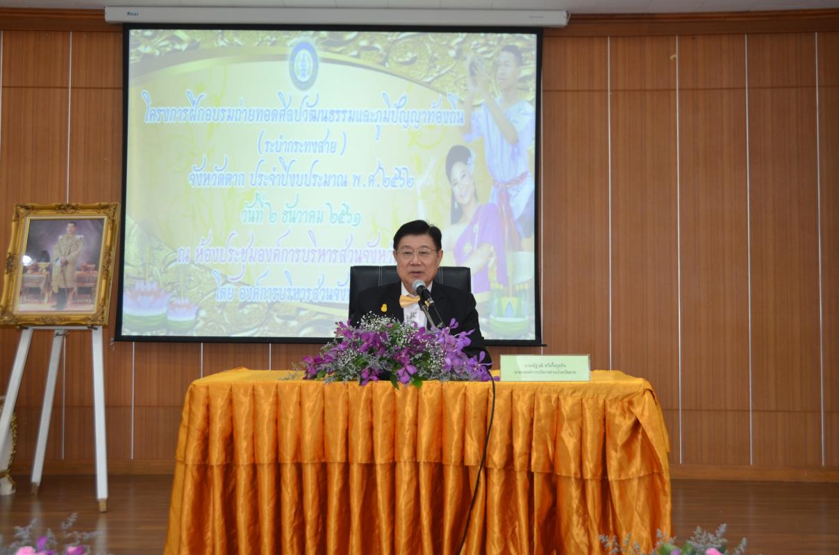 วันที่ 2 ธันวาคม พ.ศ.2561 นายณัฐวุฒิ ทวีเกื้อกูลกิจ นายกองค์การบริหารส่วนจังหวัดตาก เป็นประธานเปิดโครงการฝึกอบรมถ่ายทอดศิลปวัฒนธรรมและภูมิปัญญาท้องถิ่น ( ระบำกระทงสาย ) จังหวัดตาก ประจำปีงบประมาณ 2562 ณ ห้องประชุมองค์การบริหารส่วนจังหวัดตาก โดยมีนางสาวสุพัตรา เสาร์เรือน ผู้อำนวยการกองการศึกษา ศาสนา และวัฒนธรรม กล่าวรายงาน และได้รับเกียรติจากนางสาวรัตนา ตองใจ ผู้อำนวยการกลุ่มส่งเสริมศาสนา ศิลปะและวัฒนธรรม สำนักงานวัฒนธรรมจังหวัดตาก และนายอรุณ พืชเขียว ครูผู้ช่วย โรงเรียนบ้านขะเนจื้อ มาเป็นวิทยากรบรรยายให้ความรู้ วัตถุประสงค์ในการจัดโครงการนี้ เพื่อเพิ่มพูนองค์ความรู้มรดกภูมิปัญญา คุณค่าทางด้านศาสนา ประเพณีวัฒนธรรม เอกลักษณ์ความเป็นไทย ที่ยึดถือปฏิบัติ และสืบสานศิลปวัฒนธรรม ภูมิปัญญาท้องถิ่นให้คงอยู่สืบไป มีกลุ่มเป้าหมายเป็นเด็กและเยาวชนในจังหวัดตาก เข้าร่วมจำนวน 100 คน