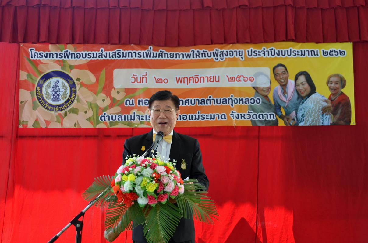 วันที่ 20 พฤศจิกายน พ.ศ.2561 นายณัฐวุฒิ ทวีเกื้อกูลกิจ นายกองค์การบริหารส่วนจังหวัดตาก เป็นประธานเปิดโครงการอบรมส่งเสริมการเพิ่มศักยภาพให้กับผู้สูงอายุ ประจำปีงบประมาณ 2562 ณ เทศบาลตำบลทุ่งหลวง ตำบลแม่ระเรา อำเภอแม่ระมาด จังหวัดตาก โดยมีนายภาคภูมิ บูลย์ประมุข รองนายกองค์การบริหารส่วนจังหวัดตาก กล่าวรายงาน วัตถุประสงค์ในการจัดโครงการนี้เพื่อให้ความรู้เรื่องการดำรงชีวิตของผู้สูงอายุ การใช้ชีวิตให้มีคุณค่า และการเป็นผู้นำ เป็นตัวอย่างที่ดีในกลุ่ม/ชุมชน/สังคม และถ่ายทอดให้กับสังคม มีกลุ่มเป้าหมายเป็นผู้สูงอายุอำเภอแม่ระมาดเข้าร่วมจำนวน 550 คน
